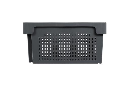 Large stack & nest container with up to 50 litres of space for your goods, with perforated longitudinal sides and perforated base, finish discreet grey.