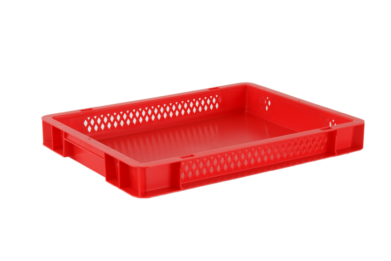 load carrying tray with perforated side walls on the long sides for the identification of the goods allowing a constant air circulation, in fashionable red.