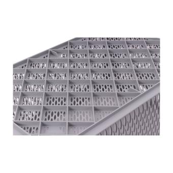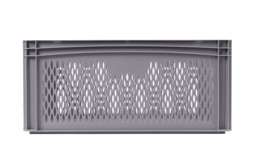 Through a perforated base and sides design, this stacking container ensures transparency, air circulation as well as a drainage possibility for liquids, weighs only 1.8kg and has a useful volume of 52 litres. In a grey design.