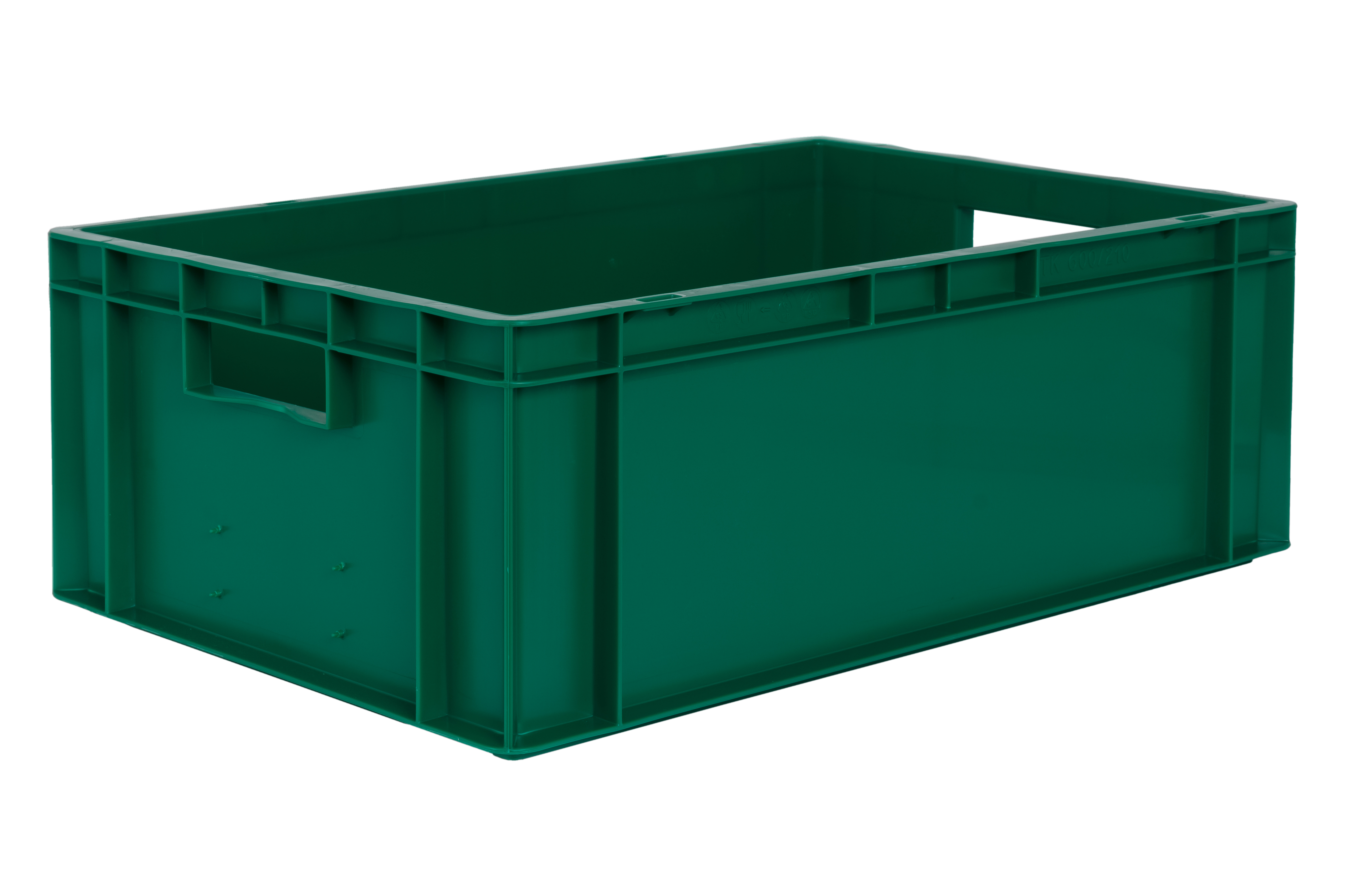 Basic information Article number: 01640210AEG Article type: Stacking Boxes Color: green Material : PP Shipping unit : 1 piece Quantity per pallet : 36 pieces Quantity per carton : 4 pieces More product features Handles : two Description sides : closed Base design : solid, no ribs Suitable for food-contact : suitable for food-contact Dimensions and loads External dimensions (approx.) : 600 x 400 x 210 mm Internal dimensions (approx.) : 551 x 352 x 200 mm Load capacity stat. (approx.) : 50 kg Usable volume (approx.) : 39 l -