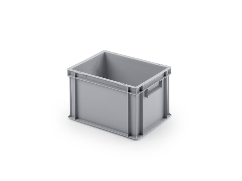 Basic information Article number: 01430233M Article type: Stacking Boxes Color: light grey Material : PP Shipping unit : 1 piece Quantity per pallet : 64 pieces Quantity per carton : 4 pieces More product features Handles : recessed grip Description sides : closed Base design : solid, no ribs Dimensions and loads External dimensions (approx.) : 400 x 300 x 235 mm Internal dimensions (approx.) : 366 x 266 x 232 mm Usable volume (approx.) : 23 l -