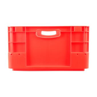 Basic information Article number: 01640220SR Article type: Stacking Boxes Color: red Material : PP Shipping unit : 1 piece Quantity per pallet : 40 pieces Quantity per carton : 2 pieces More product features Handles : two Description sides : closed Base design : solid, no ribs Suitable for food-contact : suitable for food-contact Dimensions and loads External dimensions (approx.) : 600 x 400 x 220 mm Internal dimensions (approx.) : 567 x 367 x 216 mm Load capacity stat. (approx.) : 50 kg Usable volume (approx.) : 40 l -