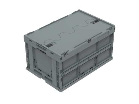 Basic information Article number: 04640321FV Article type: Folding Boxes Color: dark grey Material : PP Shipping unit : 1 piece Quantity per pallet : 100 pieces Quantity per carton : 8 pieces More product features Handles : two, with finger holes Description sides : closed Base design : solid, no ribs Dimensions and loads External dimensions (approx.) : 600 x 400 x 330 mm Internal dimensions (approx.) : 555 x 355 x 310 mm Folded height (approx.) : 90 mm Load capacity stat. (approx.) : 60 kg Usable volume (approx.) : 61 l -