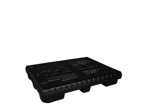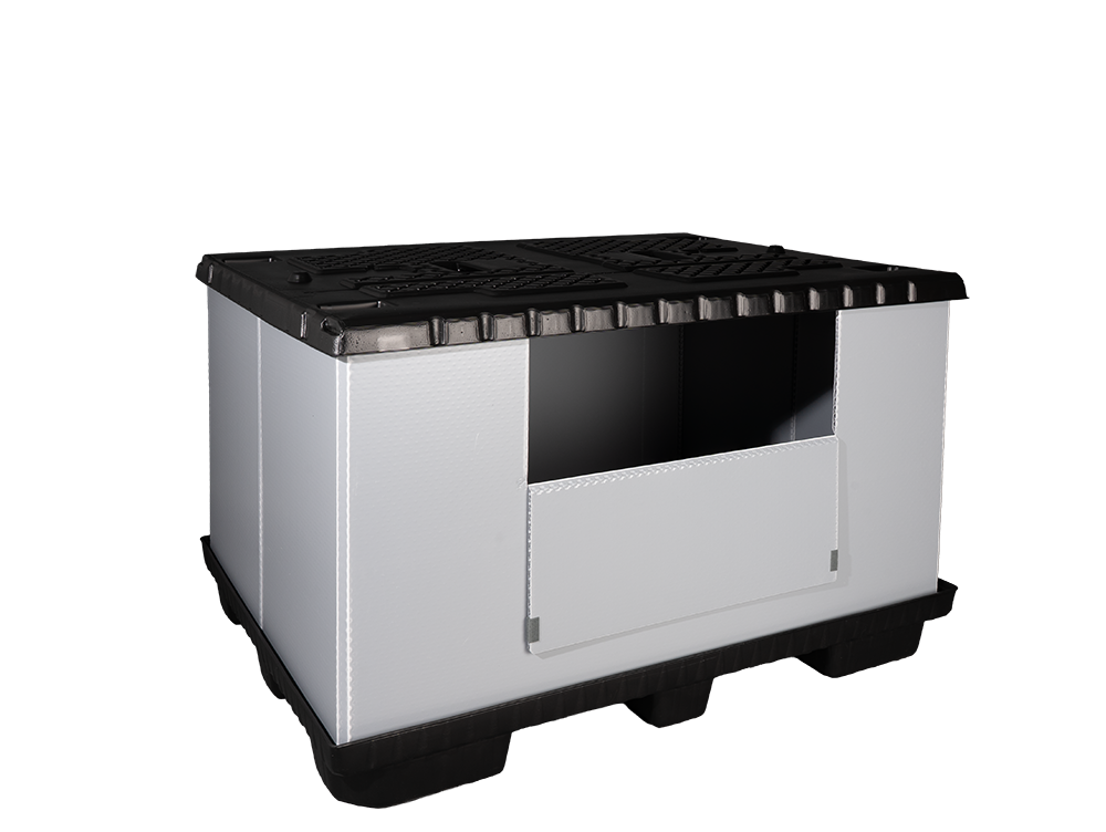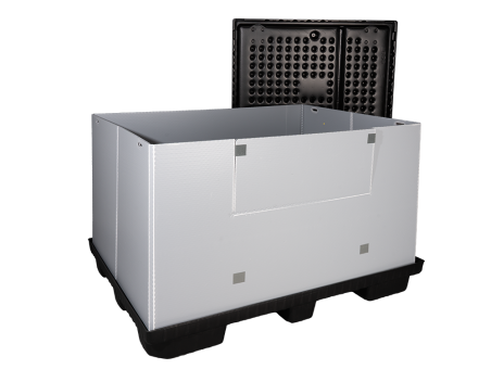 Foldable large container with nine feet and a removal opening flap on the long-side and a useful volume of 1352 litres with an empty weight of only 37kg, in a grey-black colour.