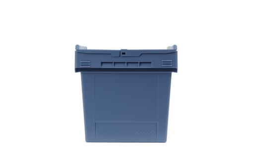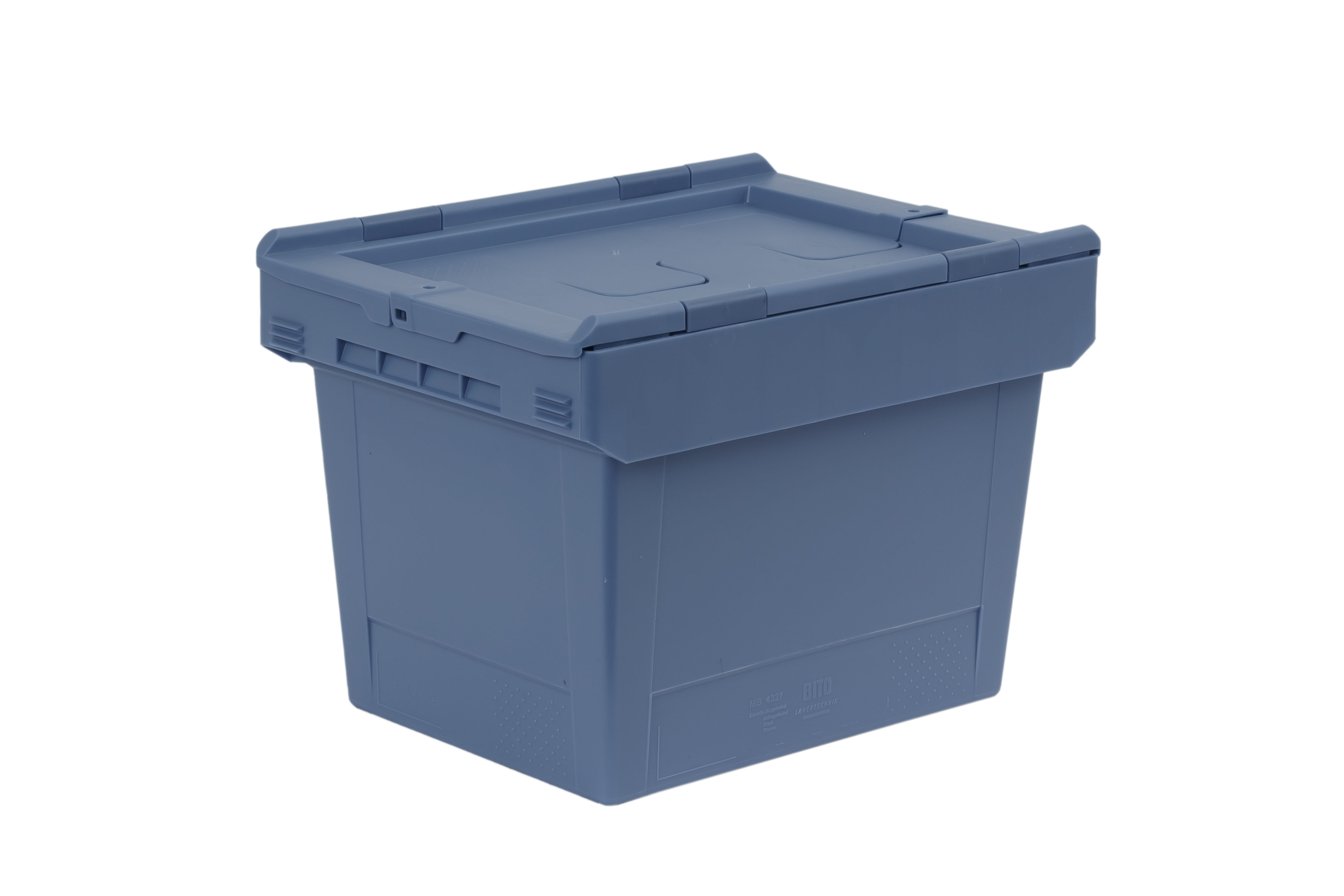 dove blue, nestable plastic container with practical undercut handles, 22 litres of useful volume and a hinged lid for protection from dust and dirt.