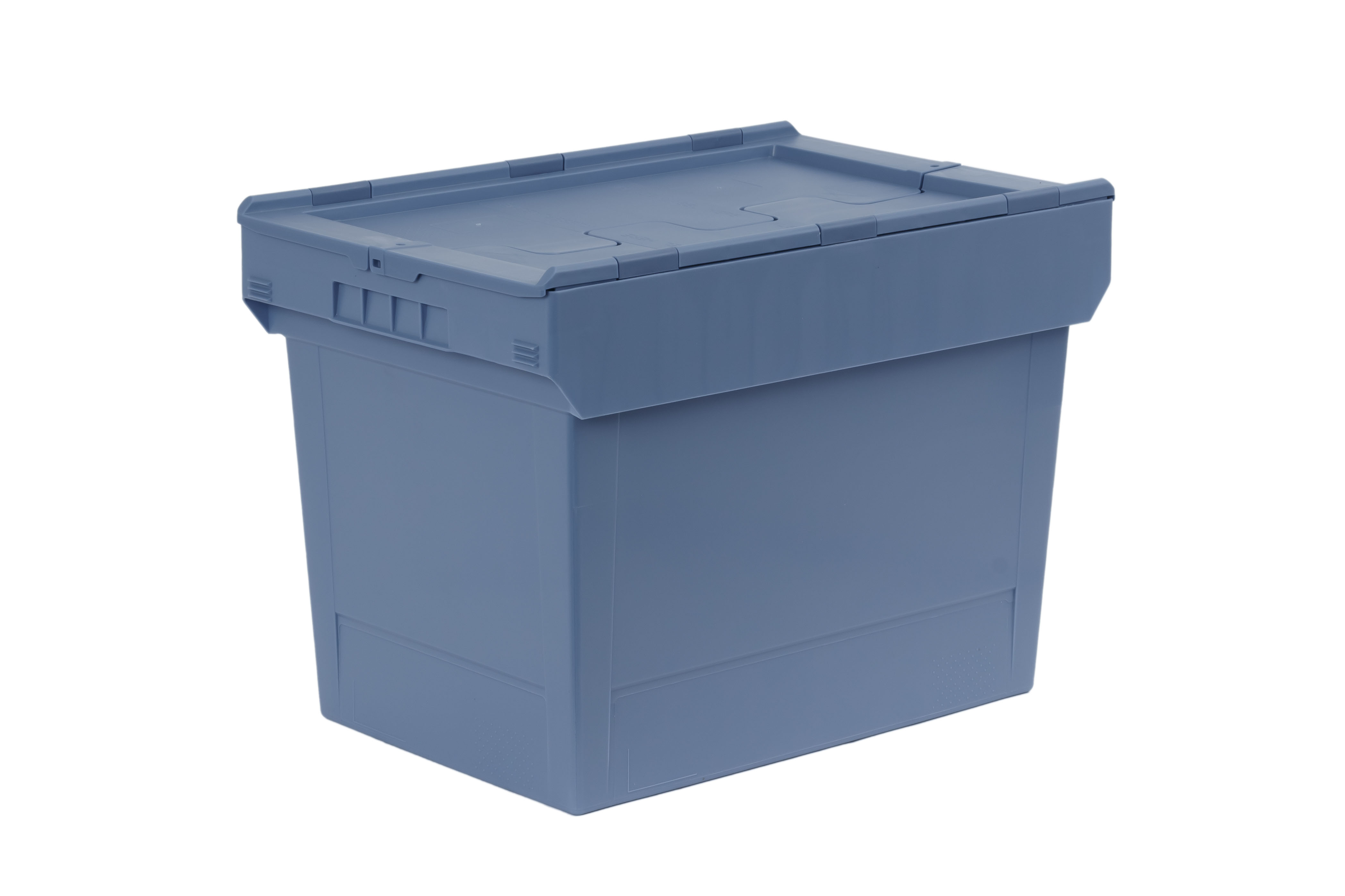 Basic information Article number: 02640423D Article type: Nestable Boxes Color: dove blue Material : PP Shipping unit : 1 piece Quantity per pallet : 56 pieces More product features Handles : recessed grip Description sides : closed Base design : solid, no ribs Dimensions and loads External dimensions (approx.) : 610 x 400 x 440 mm Internal dimensions (approx.) : 498 x 329 x 380 mm Load capacity stat. (approx.) : 35 kg Usable volume (approx.) : 74 l -