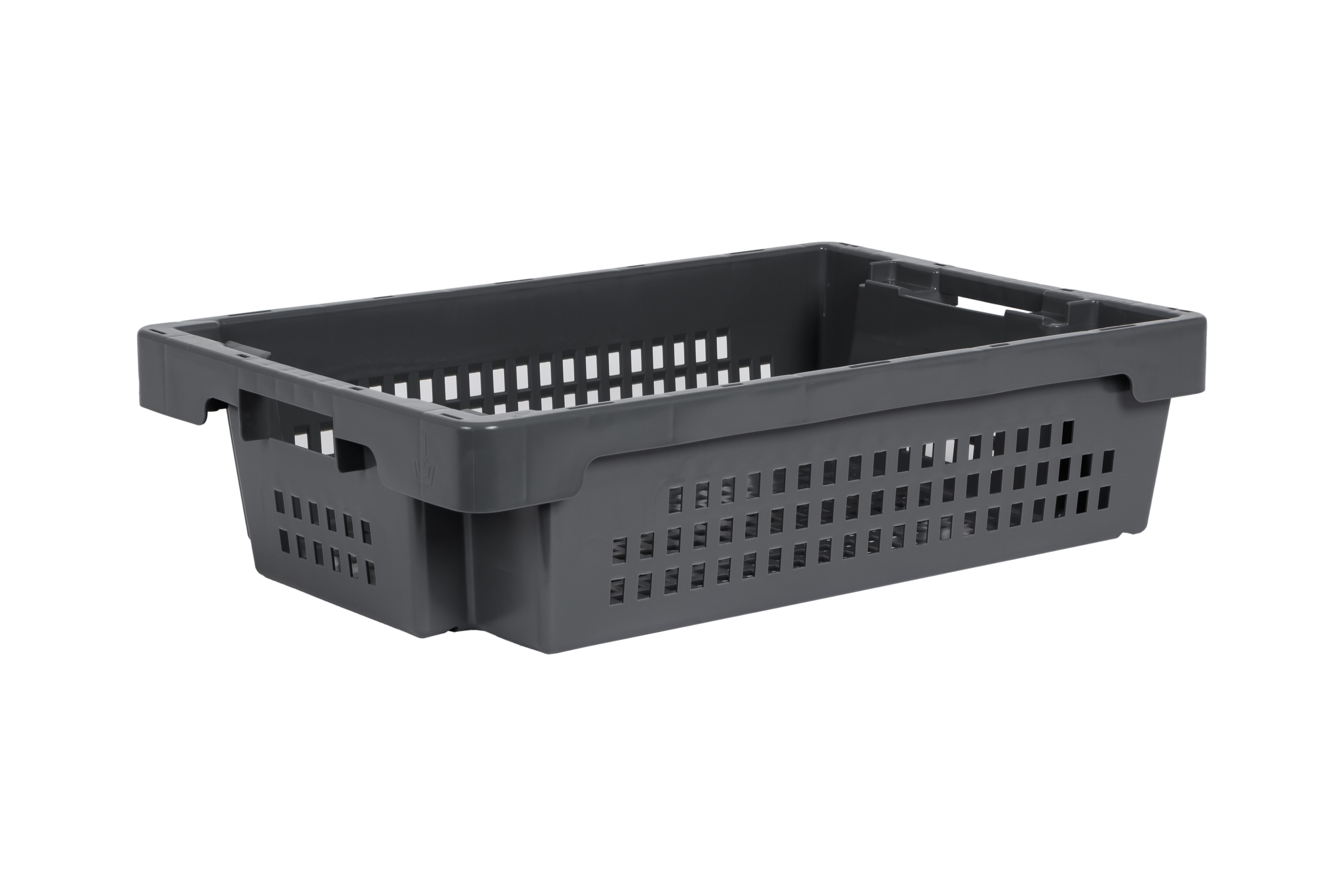 stack & nest container with 25 litres of useful volume and drainage for liquids through a perforated sides and base version. In discreet grey equipped with two undercut handles.