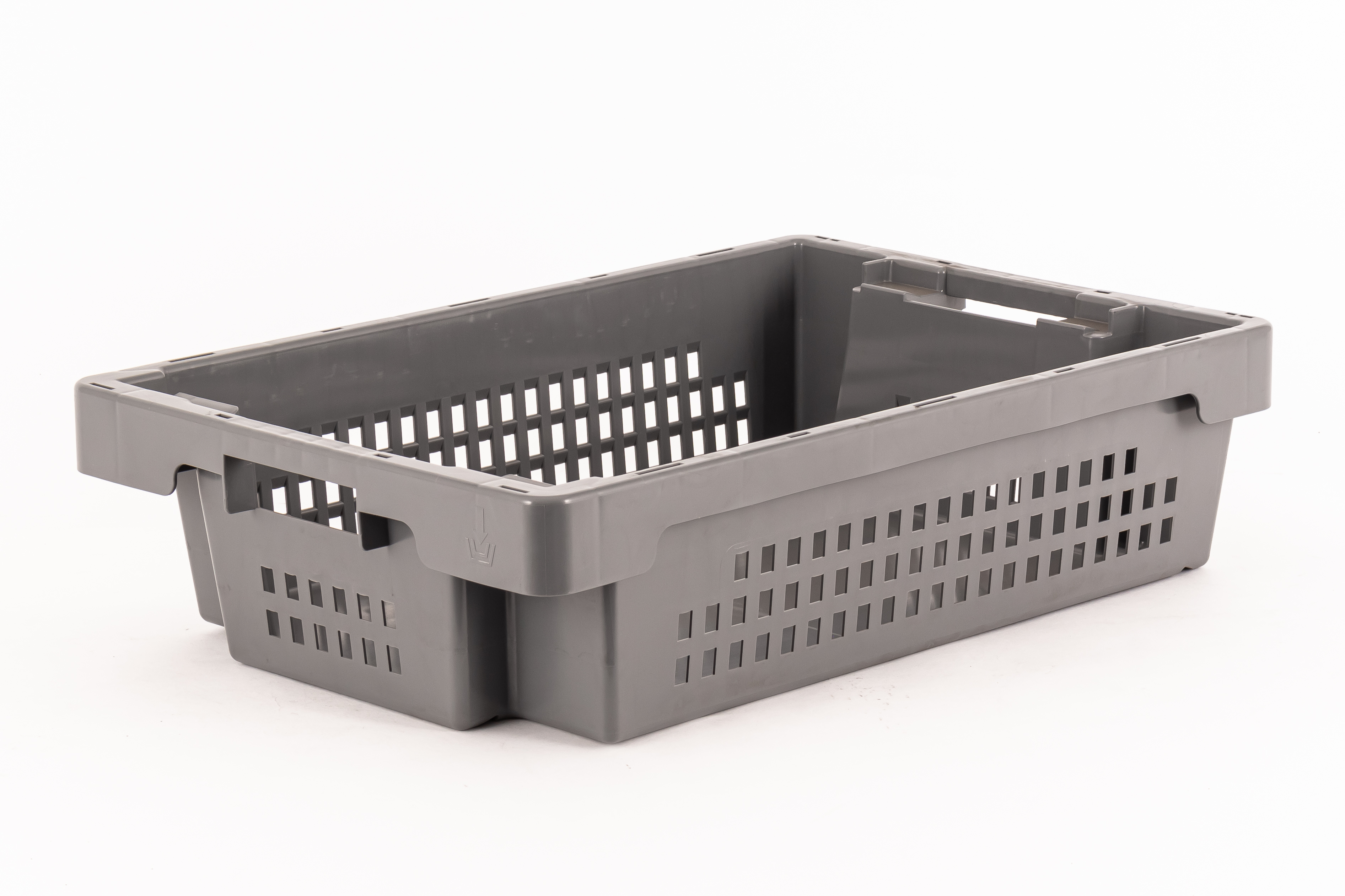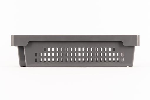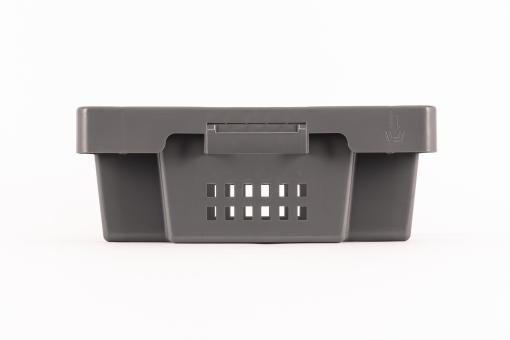 air and vision permeable, nestable, discreet grey stack & nest container with 25 litres of useful volume and perforated side walls.