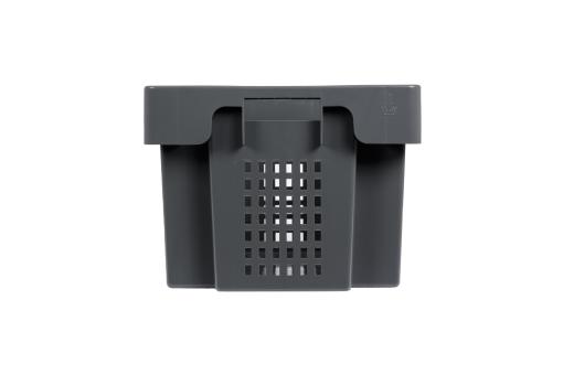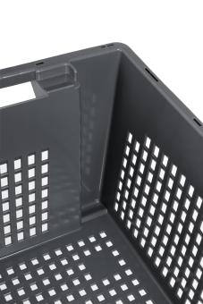 Large stack & nest container with up to 50 litres of space for your goods, with perforated longitudinal sides and perforated base, finish discreet grey.