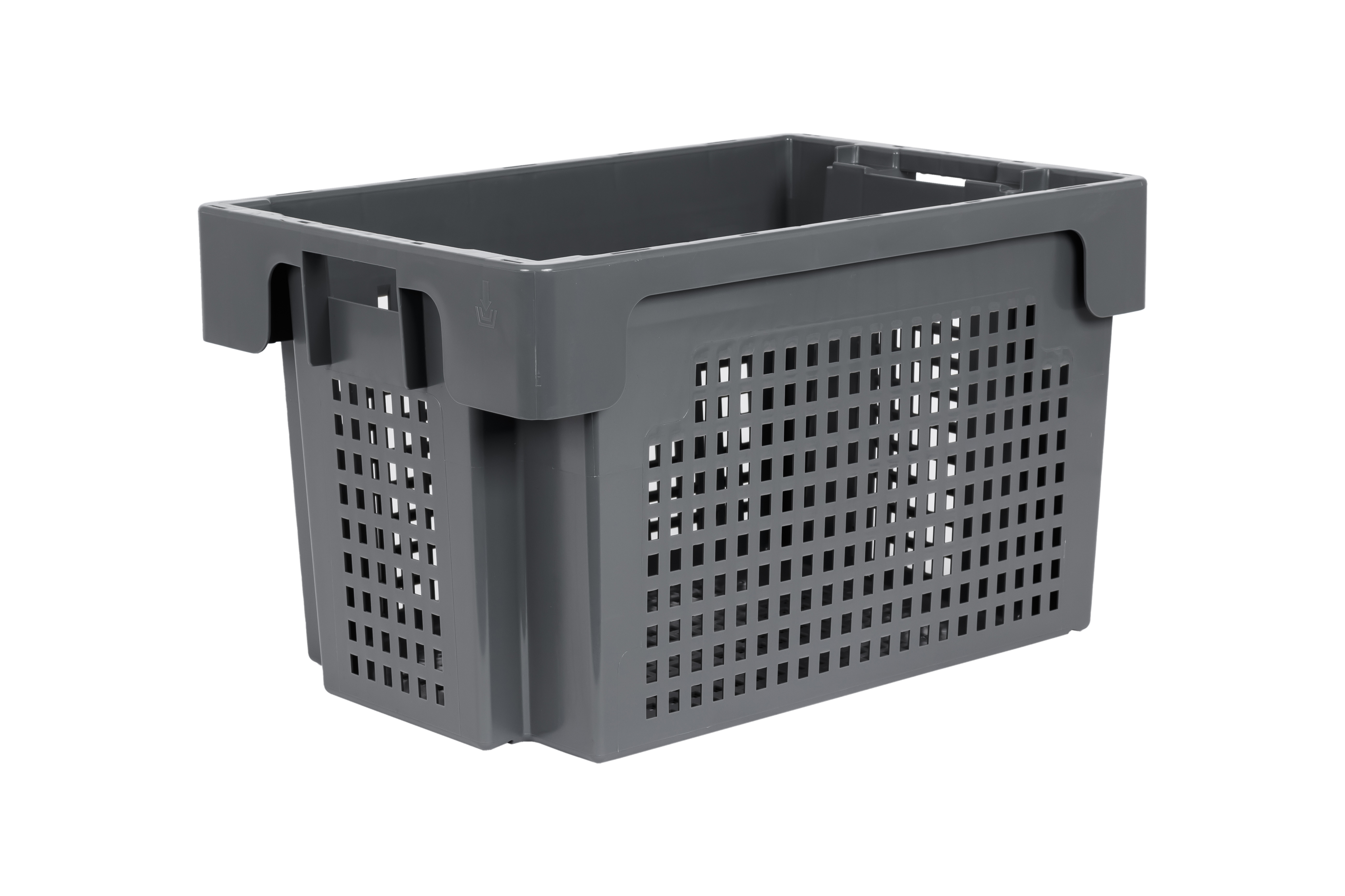 Large format stack & nest container with a total volume of 60 litres in spite of a weight well below 3kg, with two practical handles, in a distinctive grey design.