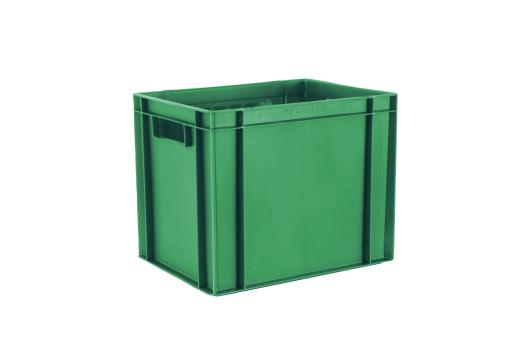 Basic information Article number: 01430320BEG Article type: Stacking Boxes Color: green Material : PP Shipping unit : 1 piece Quantity per pallet : 48 pieces Quantity per carton : 4 pieces More product features Handles : two Description sides : closed Base design : solid, no ribs Suitable for food-contact : suitable for food-contact Dimensions and loads External dimensions (approx.) : 400 x 300 x 320 mm Internal dimensions (approx.) : 356 x 255 x 305 mm Load capacity stat. (approx.) : 45 kg Usable volume (approx.) : 28 l -