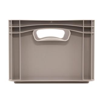 Basic information Article number: 01430222BV1 Article type: Stacking Boxes Color: grey Material : PP Shipping unit : 1 piece Quantity per pallet : 72 pieces Quantity per carton : 4 pieces More product features Handles : two Description sides : closed Base design : solid, no ribs Suitable for food-contact : suitable for food-contact Dimensions and loads External dimensions (approx.) : 400 x 300 x 220 mm Internal dimensions (approx.) : 367 x 268 x 217 mm Load capacity stat. (approx.) : 20 kg Usable volume (approx.) : 20 l -