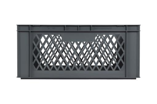 Double-sided perforated stacking container with two handles and a total of 50 litres of useful volume, in a grey colour.
