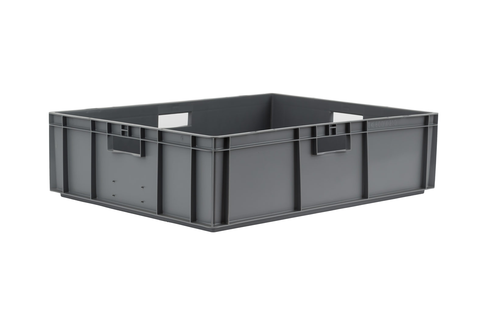Basic information Article number: 01860210EV Article type: Stacking Boxes Color: grey Material : PP Shipping unit : 1 piece Quantity per pallet : 18 pieces Quantity per carton : 2 pieces More product features Handles : four Description sides : closed Base design : solid, no ribs Suitable for food-contact : suitable for food-contact Dimensions and loads External dimensions (approx.) : 800 x 600 x 210 mm Internal dimensions (approx.) : 740 x 545 x 200 mm Load capacity stat. (approx.) : 80 kg Usable volume (approx.) : 81 l -