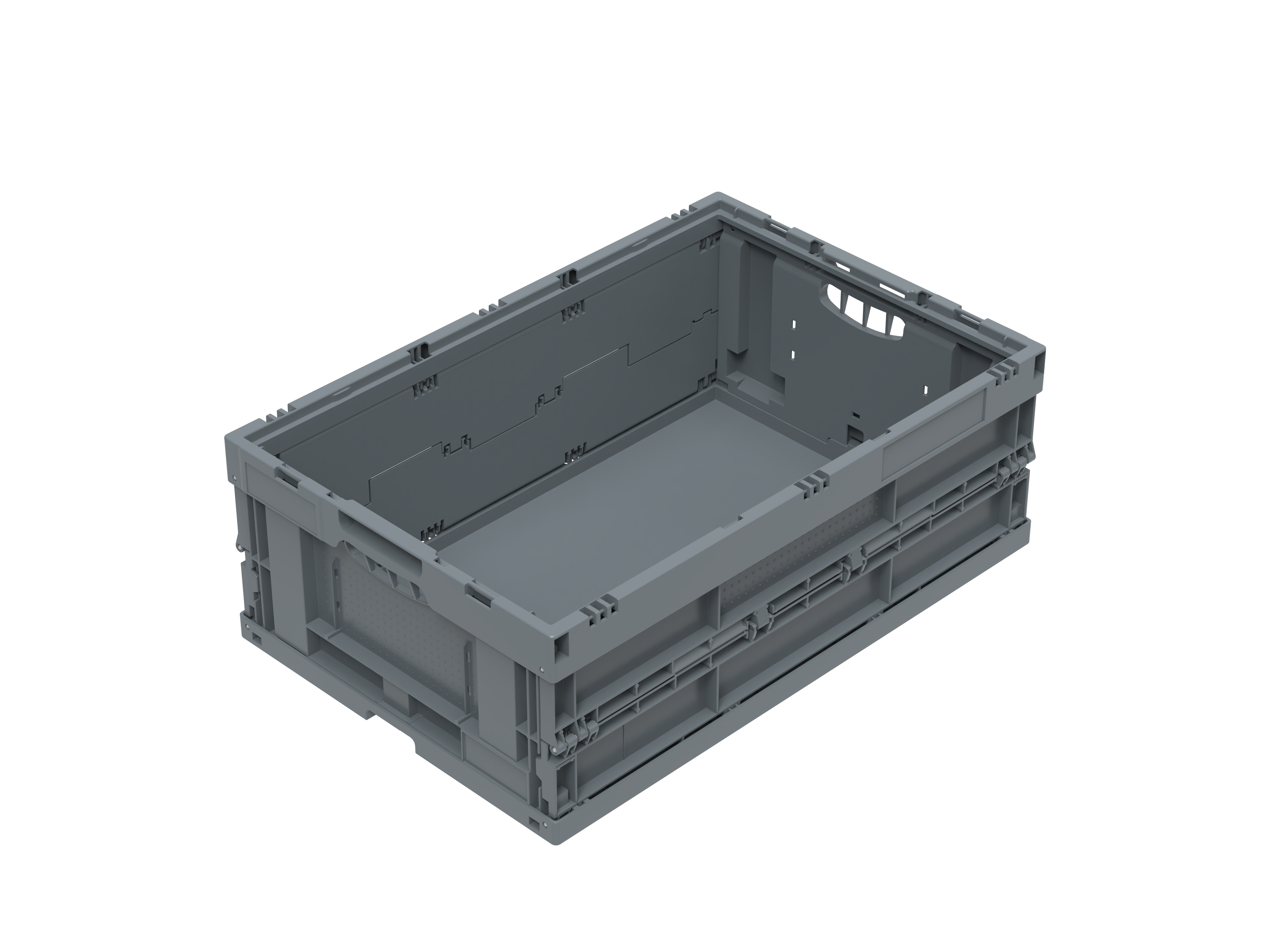- Volumenreduzierung: Durch simples Zusammenfalten der Wände reduziert sich das Leervolumen um ca. 67 %. Das spart Lager- und Transportkosten für die Rückführung des Leerguts und macht die Anwendung besonders nachhaltig und wirtschaftlich.