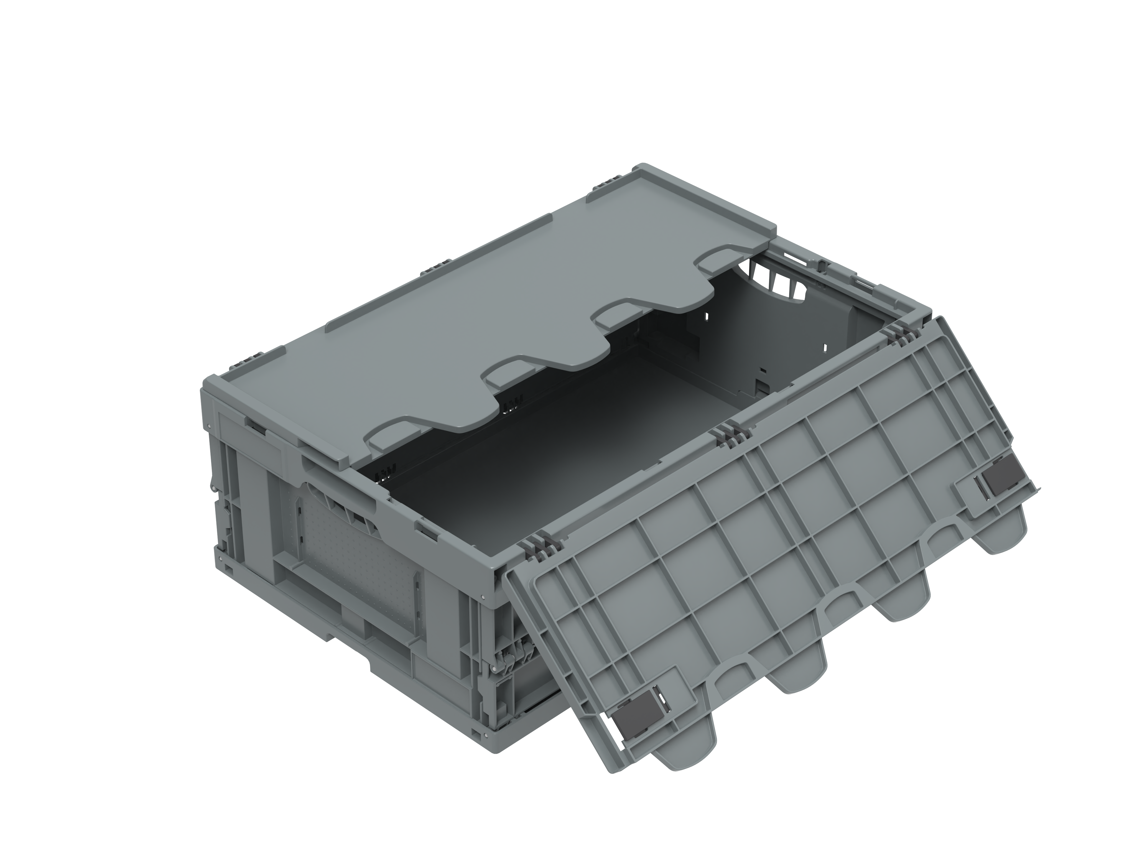 - Unsere meistverkaufte Faltbox, die 6422 NG DL, bekommen Sie hier mit passendem längsseitigen Scharnierdeckel mit Verriegelungen – so sichern Sie Ihre Waren vor Staub und äußeren Einflüssen.
