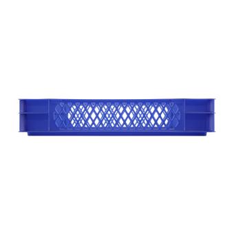Band 75 2 bleu - Le deuxième modèle de la gamme Band 75 est doté d'un fond lisse et de parois ajourées ainsi que de petits éléments de treillis sur les petits côtés, pour un meilleur aperçu des marchandises contenues dans le bac en plastique et une meilleure circulation de l'air. De qualité alimentaire et très facile à nettoyer, ce bac gerbable est ici proposé en bleu marine mais est aussi disponible dans 4 autres coloris.