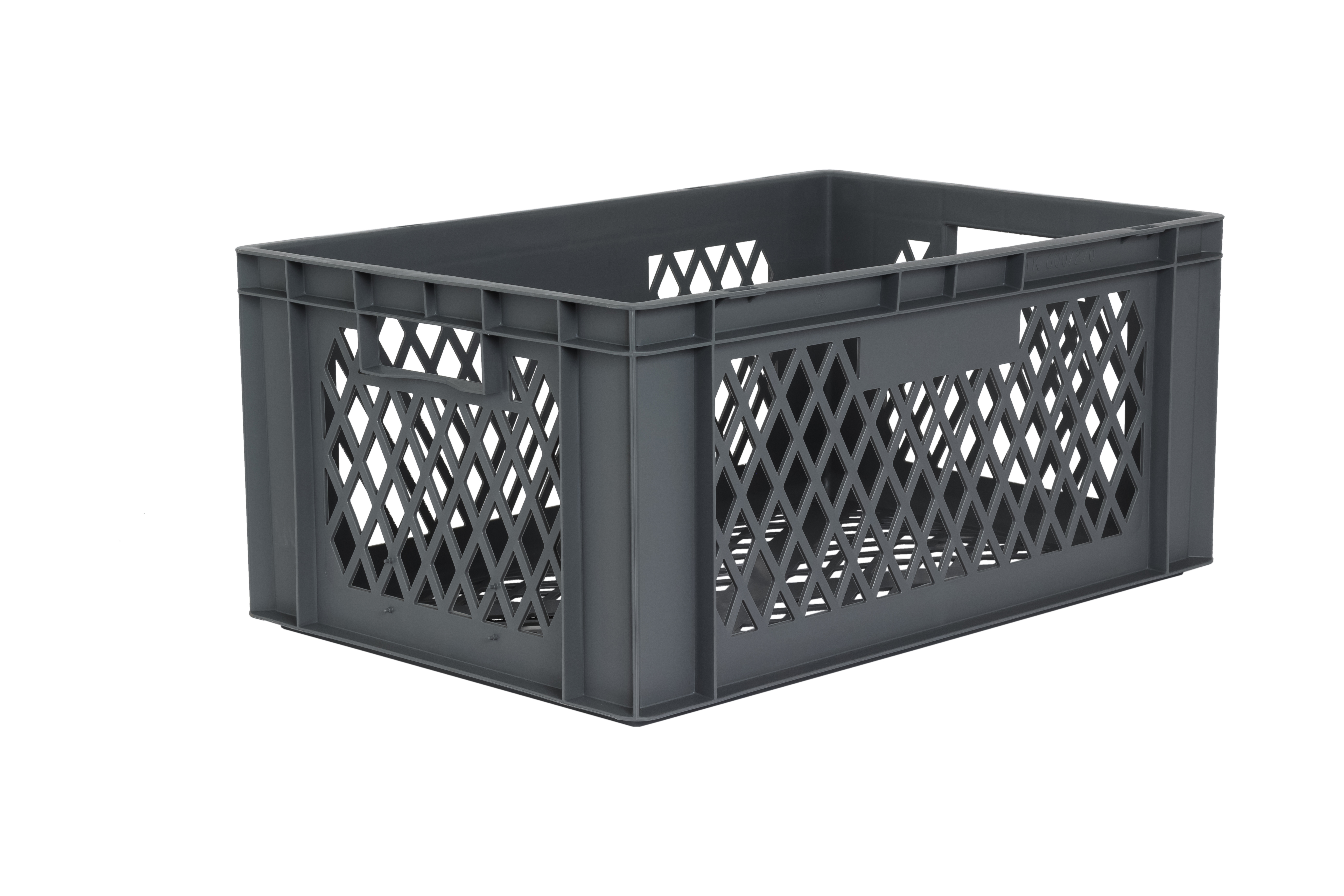 Dina 270 3 gris - Doté des même caractéristiques que le « Dina 270 1 » : Bac gerbable de norme euro, d'un volume utile de 50 litres et doté de 2 poignées ergonomiques. Apte au contact alimentaire, il résiste à des températures allant de - 20° à + 60° . Disponible dans 5 coloris, il peut être utilisé sur convoyeur à rouleaux. Il se différencie par un fond et des parois ajourées, perméables à l'air et aux liquides. Idéal pour stocker ou transporter de nombreuses denrées alimentaires.