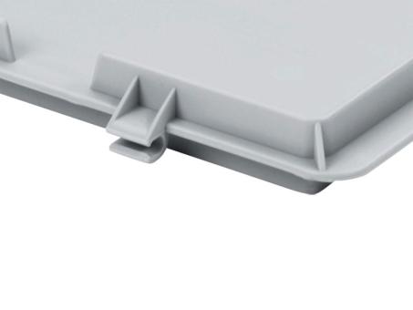 Couvercle à charnières 400x300 gris clair - Couvercle à charnières pratique avec clips de fermeture et de dimensions standard 400 x 300 mm. Convient parfaitement aux bacs gerbables correspondants de la gamme " Isy" et protège les marchandises. Modèle en gris.
