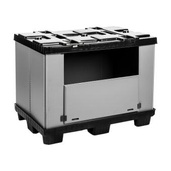 Pour gros volumes, robuste et légère à la fois. Volume de 621 l. et charge max. statique de 1 000 kg. Dimensions de base 1200x 800 mm, hauteur modulable. Durable et ergonomique pour une manutention aisée.Volume réduit de 80 %, une fois pliée. Verrouillage de la palette (sur 9 pieds) et du couvercle avec la ceinture et gerbage sécurisé grâce aux points d'ancrage sur le couvercle. Abattant de prélèvement sur le côté long. Optimise les coûts de stockage et de transport.