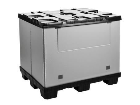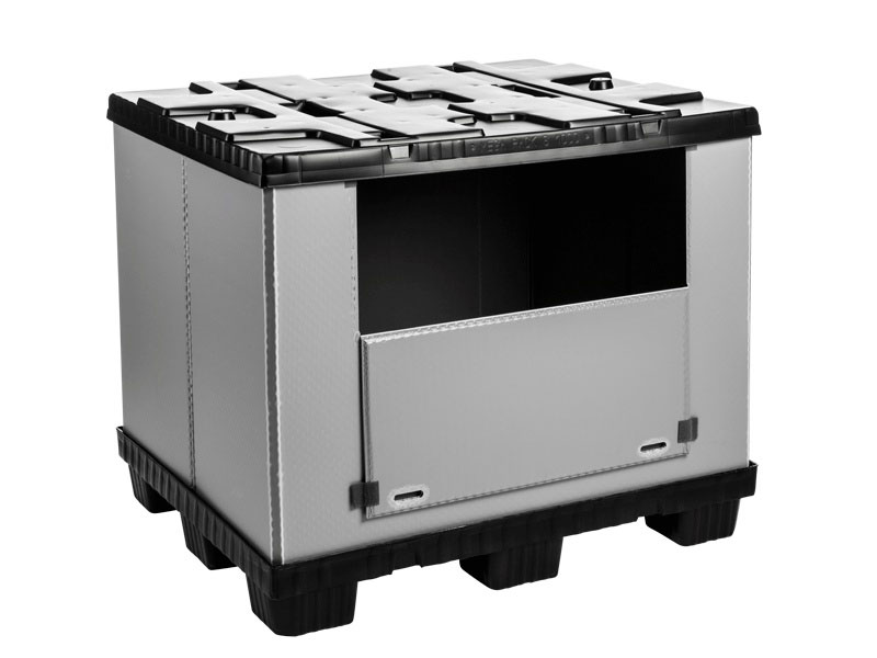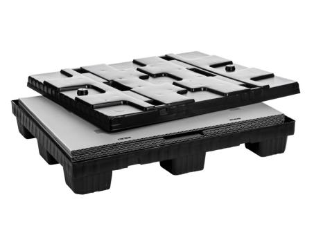 Mega-Pack 1000 gris-noir - Pour très gros volumes, robuste et légère à la fois. Volume de 895 l.et charge max. statique de 1 000 kg pour un poids propre de 29 kg. Dimensions de base 1200x 1 000 mm. Durable et ergonomique pour une manutention aisée.Volume réduit de 80 %, une fois pliée. Verrouillage de la palette (sur 9 pieds) et du couvercle avec la ceinture et gerbage sécurisé grâce aux points d'ancrage sur le couvercle. Abattant sur le côté long. Réduit les coûts de stockage et de transport.