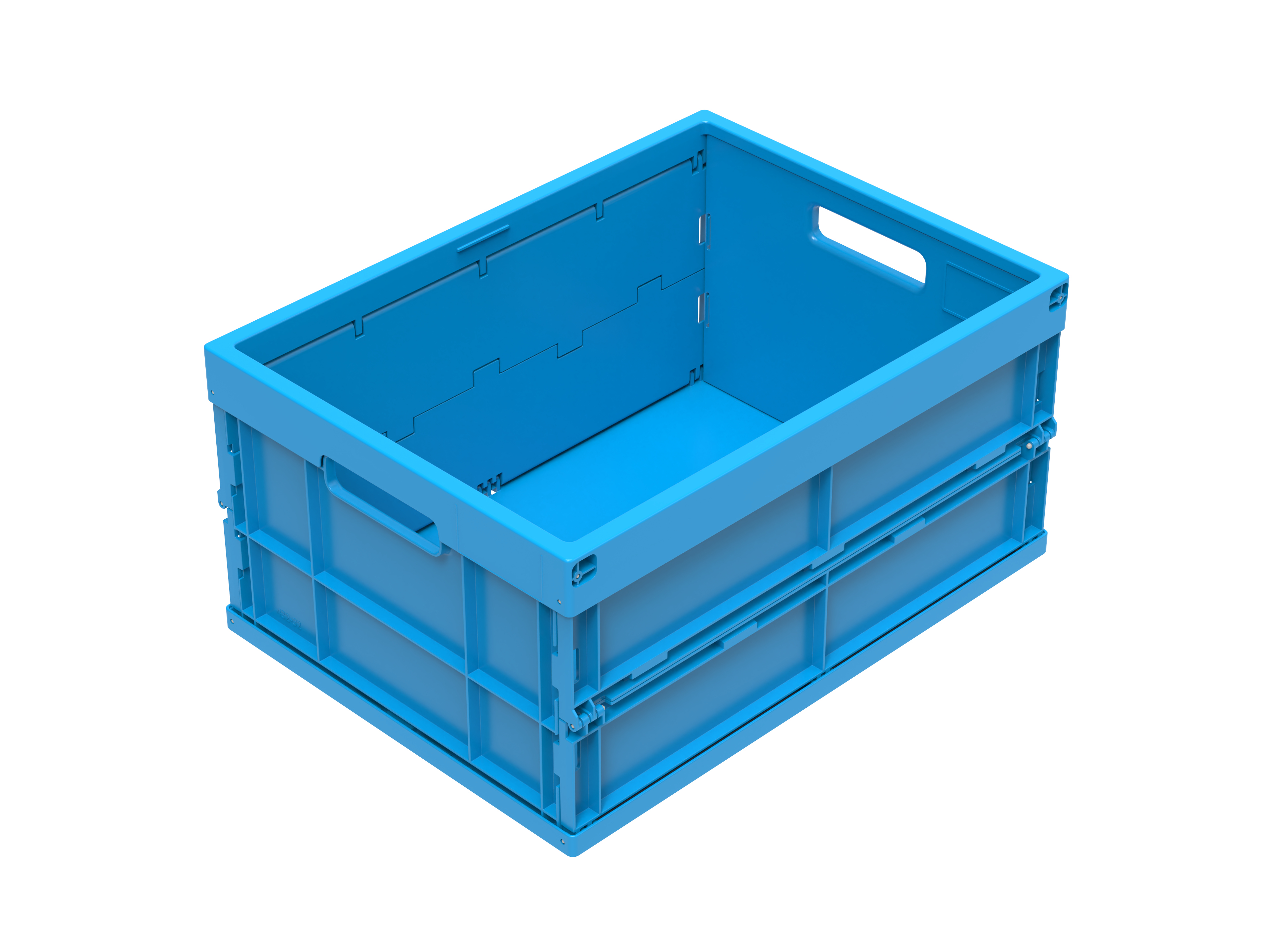 Practical and sturdy folding box with ribbed base, two ergonomic handles and 32 litres of useful volume with a minimum weight of only 1.56kg, in the WALTHER blue design.