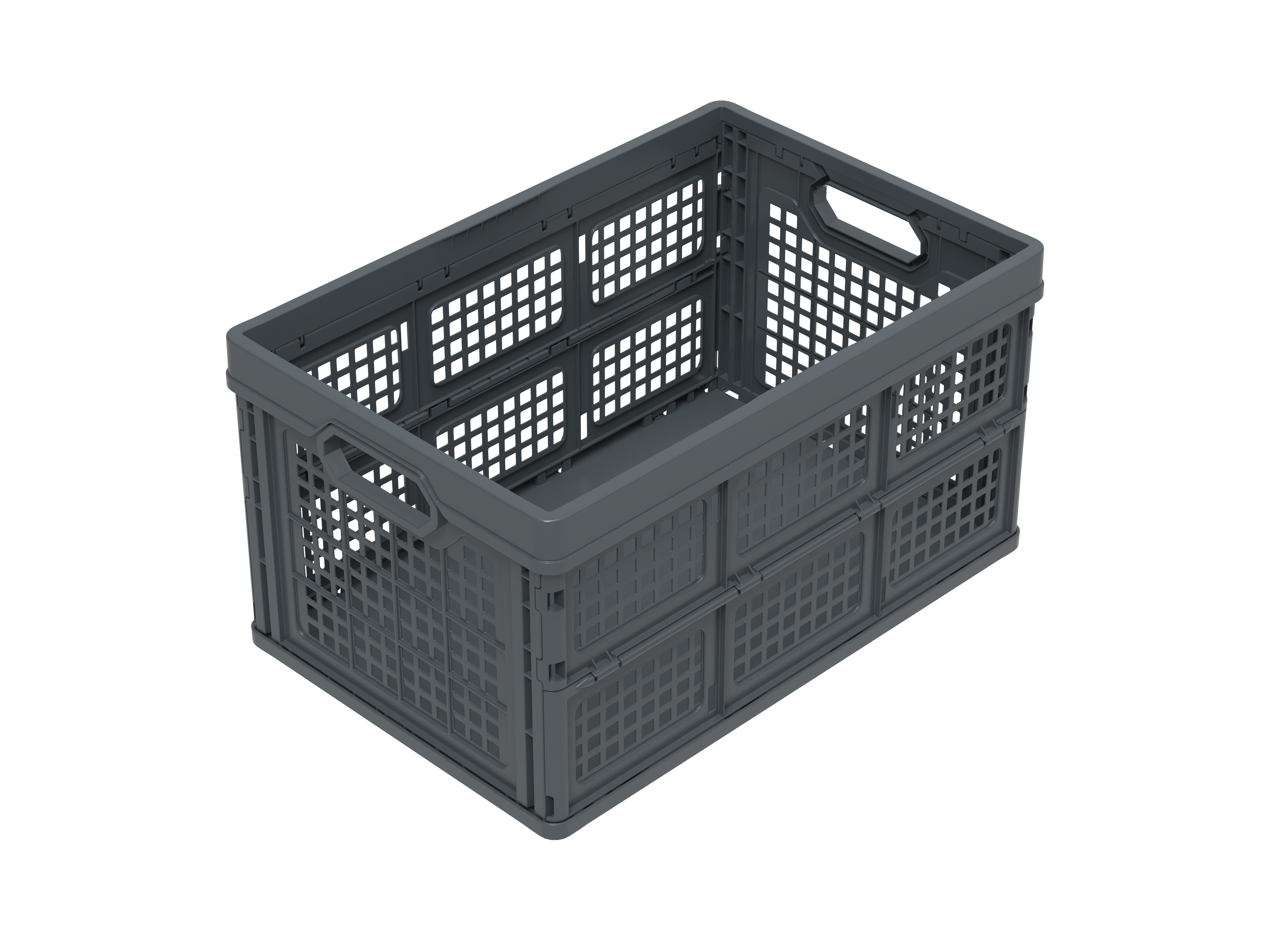 Basic information Article number: 039302V-105 Article type: Folding Boxes Color: dark grey Material : PP Shipping unit : 1 piece Quantity per pallet : 184 pieces More product features Handles : two, without finger holes Description sides : perforated Base design : closed, ribbed Dimensions and loads External dimensions (approx.) : 530 x 350 x 285 mm Internal dimensions (approx.) : 500 x 320 x 265 mm Folded height (approx.) : 50 mm Load capacity stat. (approx.) : 15 kg Usable volume (approx.) : 42 l