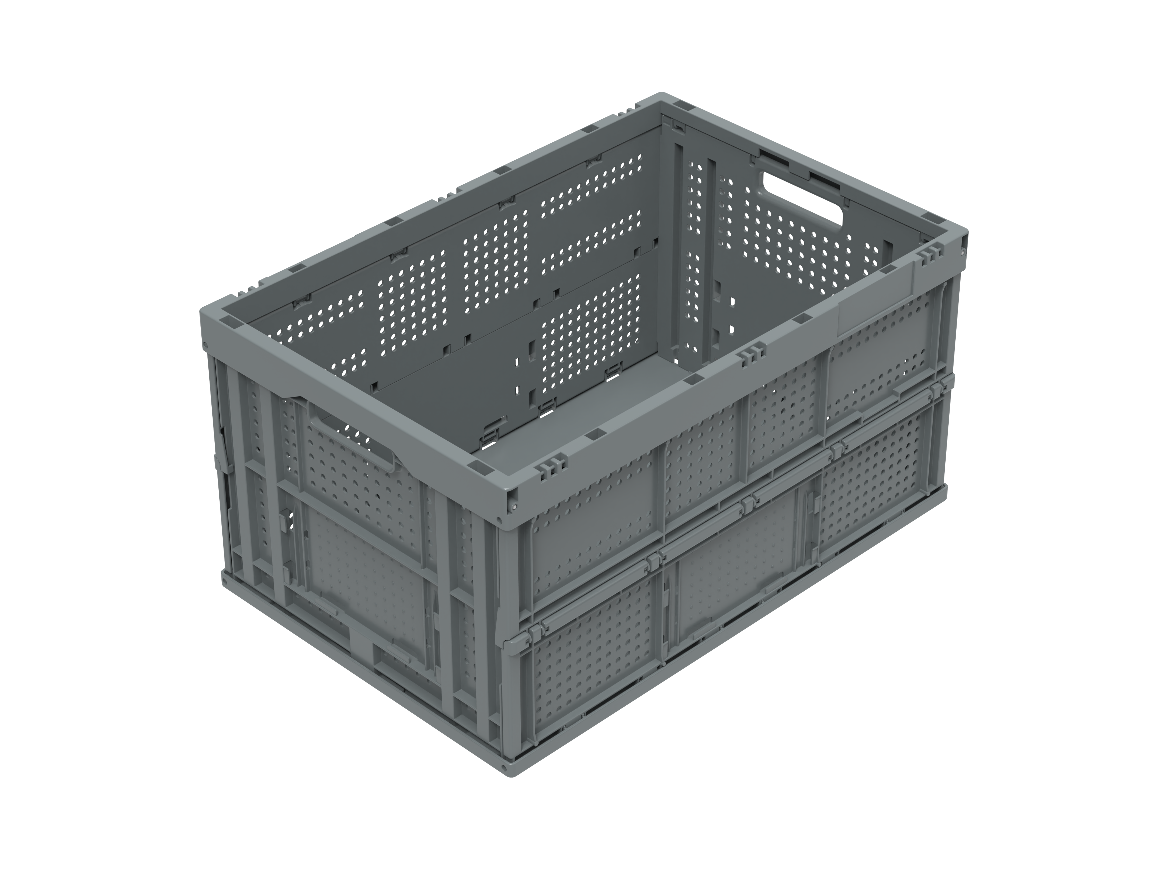 Basic information Article number: 04640315EV2 Article type: Folding Boxes Color: dark grey Material : PP Shipping unit : 1 piece Quantity per pallet : 120 pieces Quantity per carton : 10 pieces More product features Handles : two, without finger holes Description sides : perforated Base design : closed, ribbed Dimensions and loads External dimensions (approx.) : 600 x 400 x 320 mm Internal dimensions (approx.) : 570 x 370 x 305 mm Folded height (approx.) : 70 mm Load capacity stat. (approx.) : 60 kg Usable volume (approx.) : 64 l -