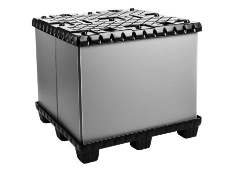 Foldable large container with nine feet and a huge useful volume of 970 litres with a minimum weight of only 21.2kg. Made of HDPE and PP, in a grey-black design.