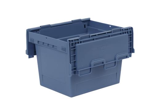 dove blue, nestable plastic container with practical undercut handles, 22 litres of useful volume and a hinged lid for protection from dust and dirt.