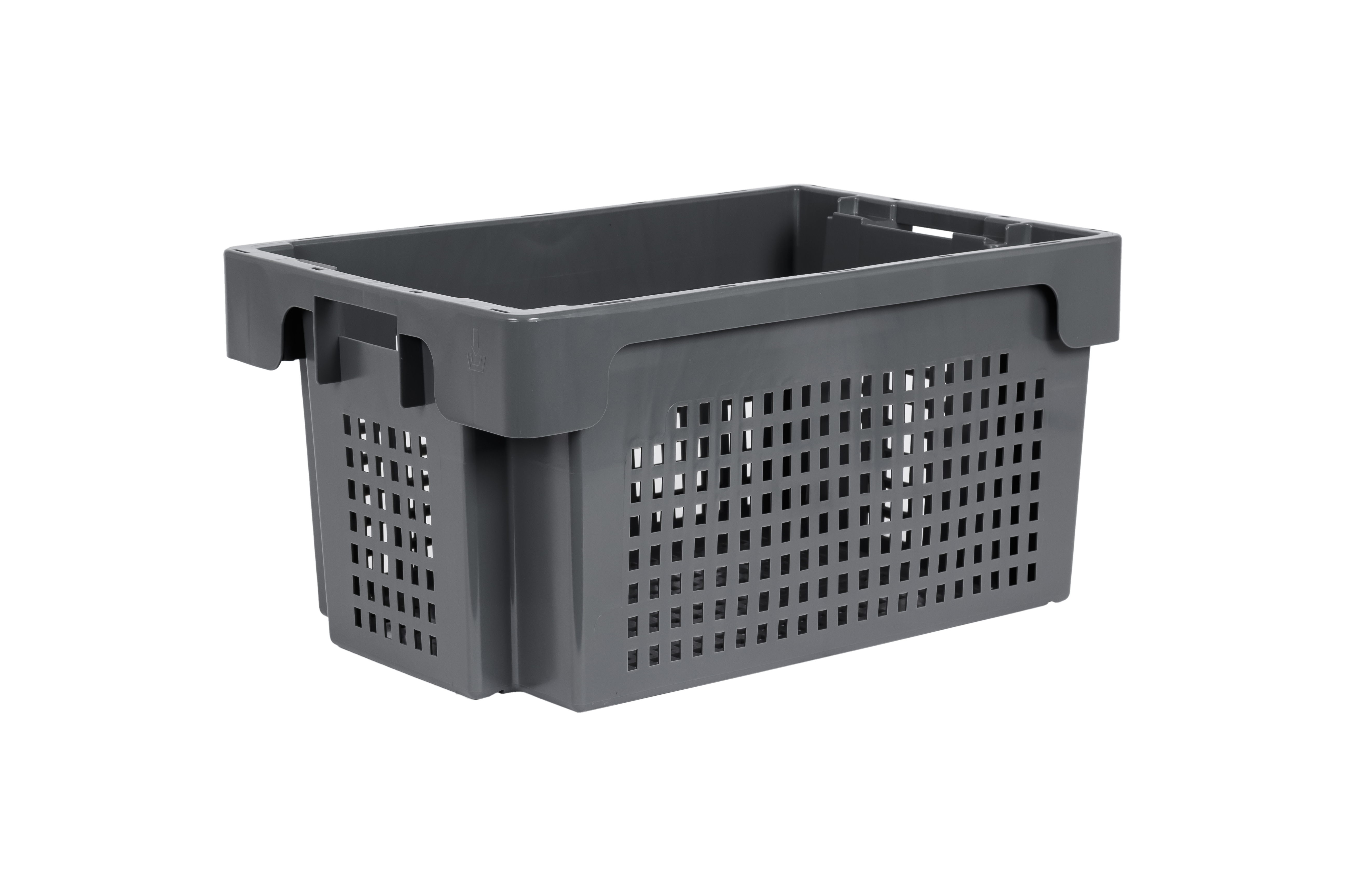 Large stack & nest container with up to 50 litres of space for your goods, with perforated longitudinal sides and perforated base, finish discreet grey.
