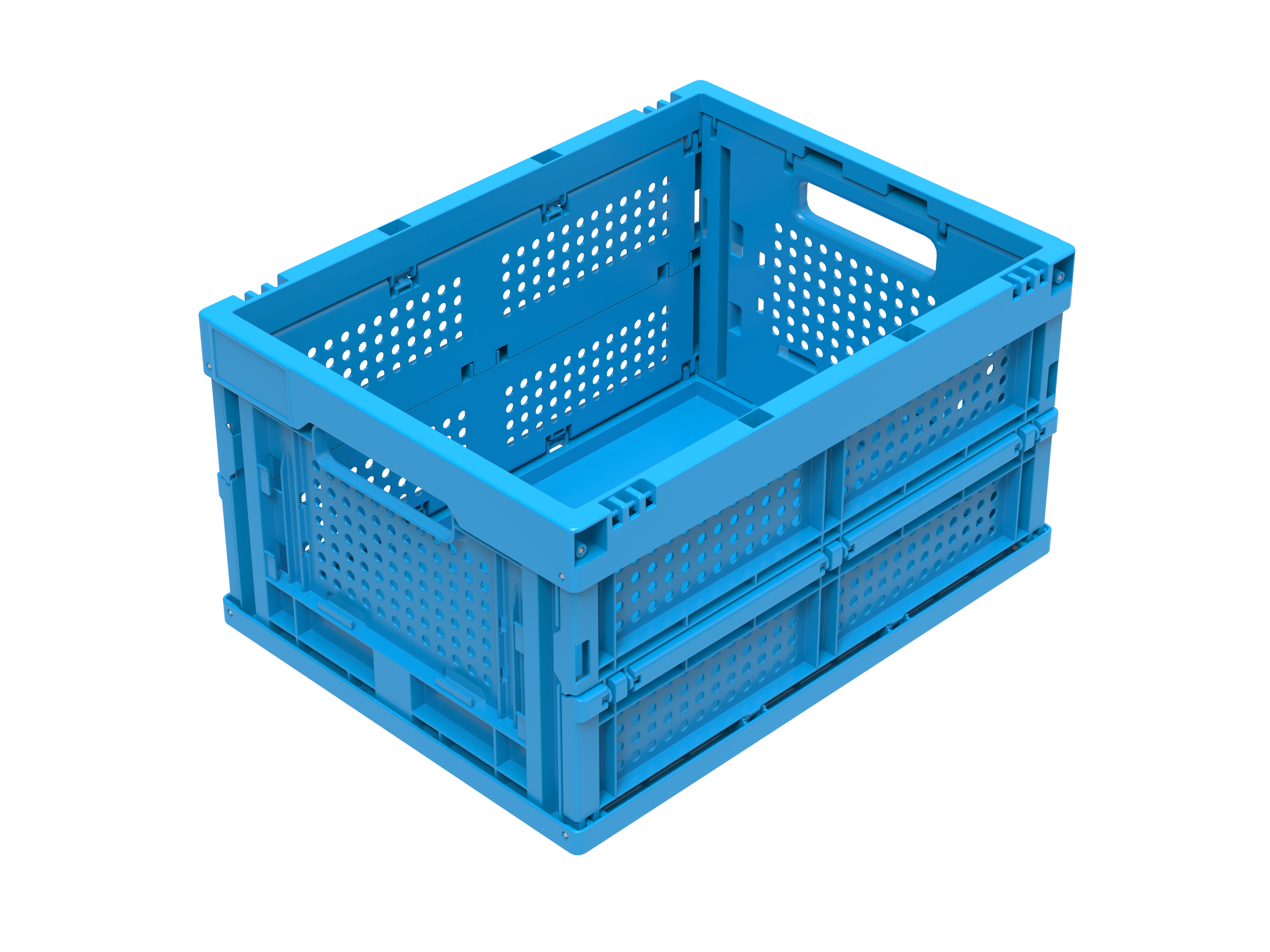 Basic information Article number: 04-1-00223 Article type: Folding Boxes Color: WALTHER-blue Material : PP Quantity per pallet : 250 pieces Quantity per carton : 24 pieces More product features Handles : two Description sides : perforated Base design : solid, no ribs Suitable for food-contact : suitable for food-contact Dimensions and loads External dimensions (approx.) : 400 x 300 x 220 mm Internal dimensions (approx.) : 360 x 260 x 205 mm Folded height (approx.) : 65 mm Load capacity stat. (approx.) : 25 kg Usable volume (approx.) : 19 l