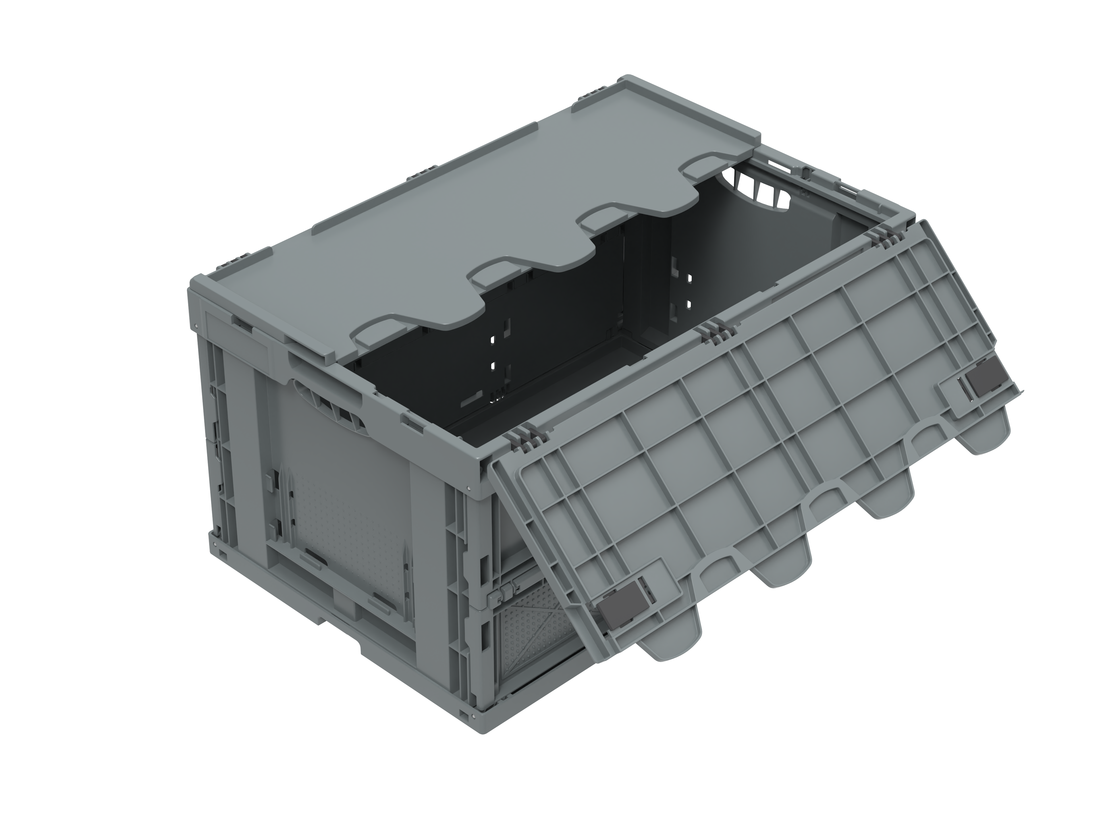 Basic information Article number: 04640321FV Article type: Folding Boxes Color: dark grey Material : PP Shipping unit : 1 piece Quantity per pallet : 100 pieces Quantity per carton : 8 pieces More product features Handles : two, with finger holes Description sides : closed Base design : solid, no ribs Dimensions and loads External dimensions (approx.) : 600 x 400 x 330 mm Internal dimensions (approx.) : 555 x 355 x 310 mm Folded height (approx.) : 90 mm Load capacity stat. (approx.) : 60 kg Usable volume (approx.) : 61 l -