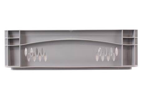 Two-sided perforated stacking container with a usable volume of 21 litres. Variant in grey.