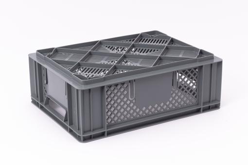 Basic information Article number: 01430142E Article type: Stacking Boxes Color: grey Material : HDPE Shipping unit : 1 piece Quantity per pallet : 112 pieces Quantity per carton : 8 pieces More product features Handles : two Description sides : perforated Base design : perforated Dimensions and loads External dimensions (approx.) : 400 x 300 x 142 mm Internal dimensions (approx.) : 372 x 272 x 128 mm Usable volume (approx.) : 13 l -