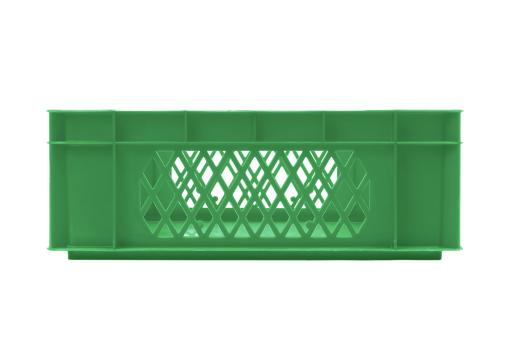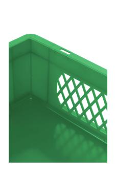 Laterally perforated stacking container with two ergonomic handles and 34 litres space for your goods at only 1.42kg empty weight. In a green colour.