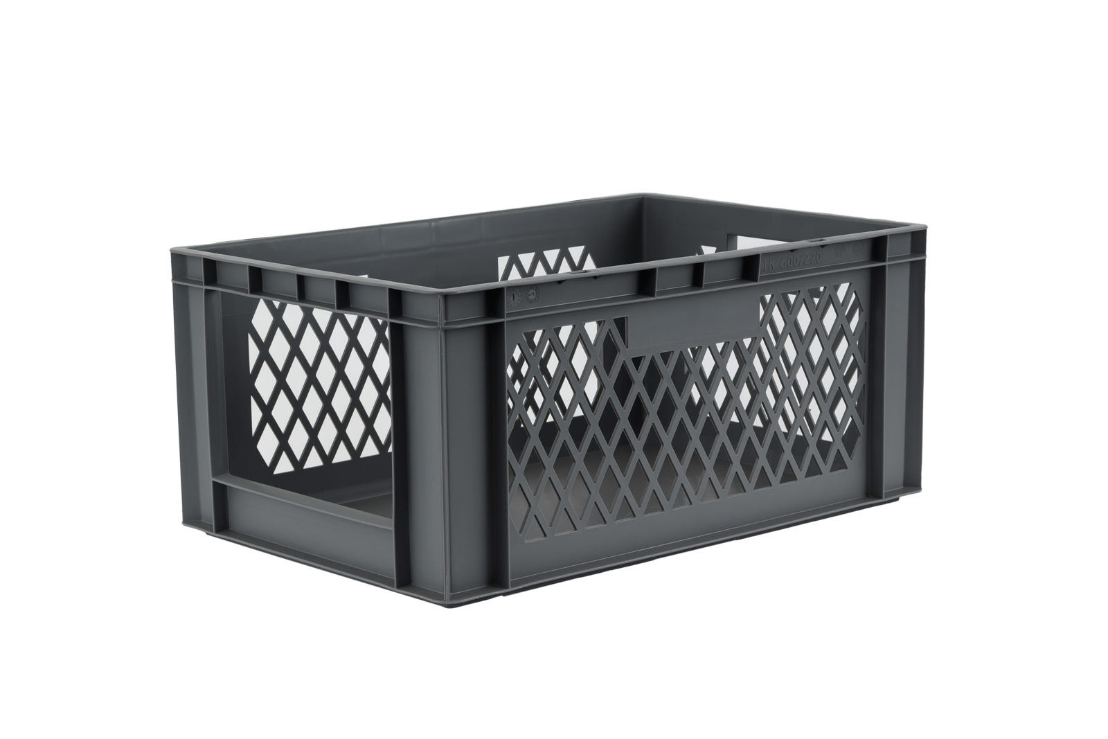 Basic information Article number: 01640270BGV Article type: Stacking Boxes Color: grey Material : PP Shipping unit : 1 piece Quantity per pallet : 28 pieces More product features Handles : one Description sides : perforated Base design : solid, no ribs Suitable for food-contact : suitable for food-contact Dimensions and loads External dimensions (approx.) : 600 x 400 x 270 mm Internal dimensions (approx.) : 551 x 352 x 255 mm Load capacity stat. (approx.) : 40 kg Usable volume (approx.) : 53 l -