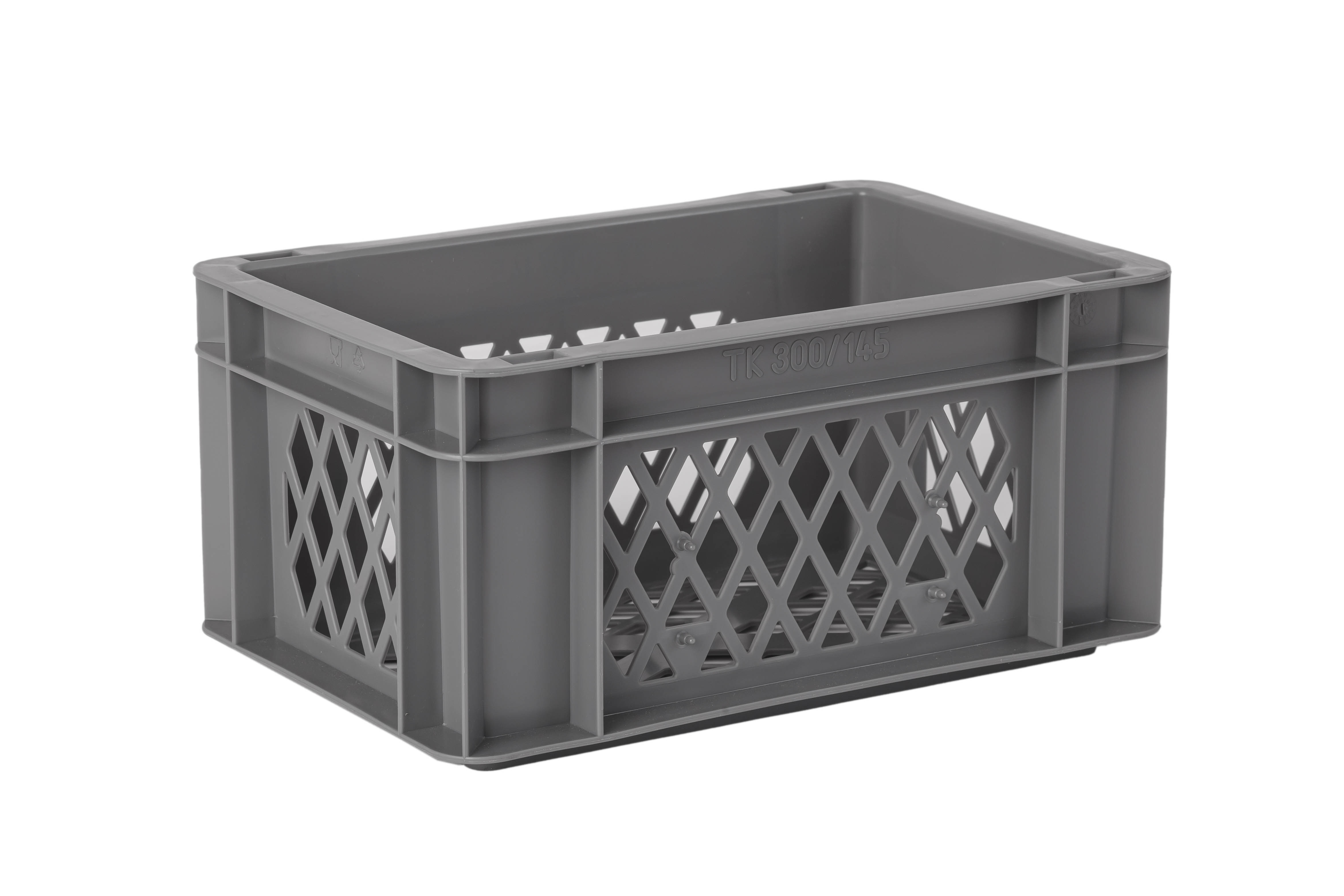 Basic information Article number: 01320145AGV Article type: Stacking Boxes Color: grey Material : PP Shipping unit : 1 piece Quantity per pallet : 224 pieces Quantity per carton : 8 pieces More product features Handles : closed hand holes Description sides : perforated Base design : perforated Suitable for food-contact : suitable for food-contact Dimensions and loads External dimensions (approx.) : 300 x 200 x 145 mm Internal dimensions (approx.) : 252 x 152 x 133 mm Load capacity stat. (approx.) : 15 kg Usable volume (approx.) : 6 l -