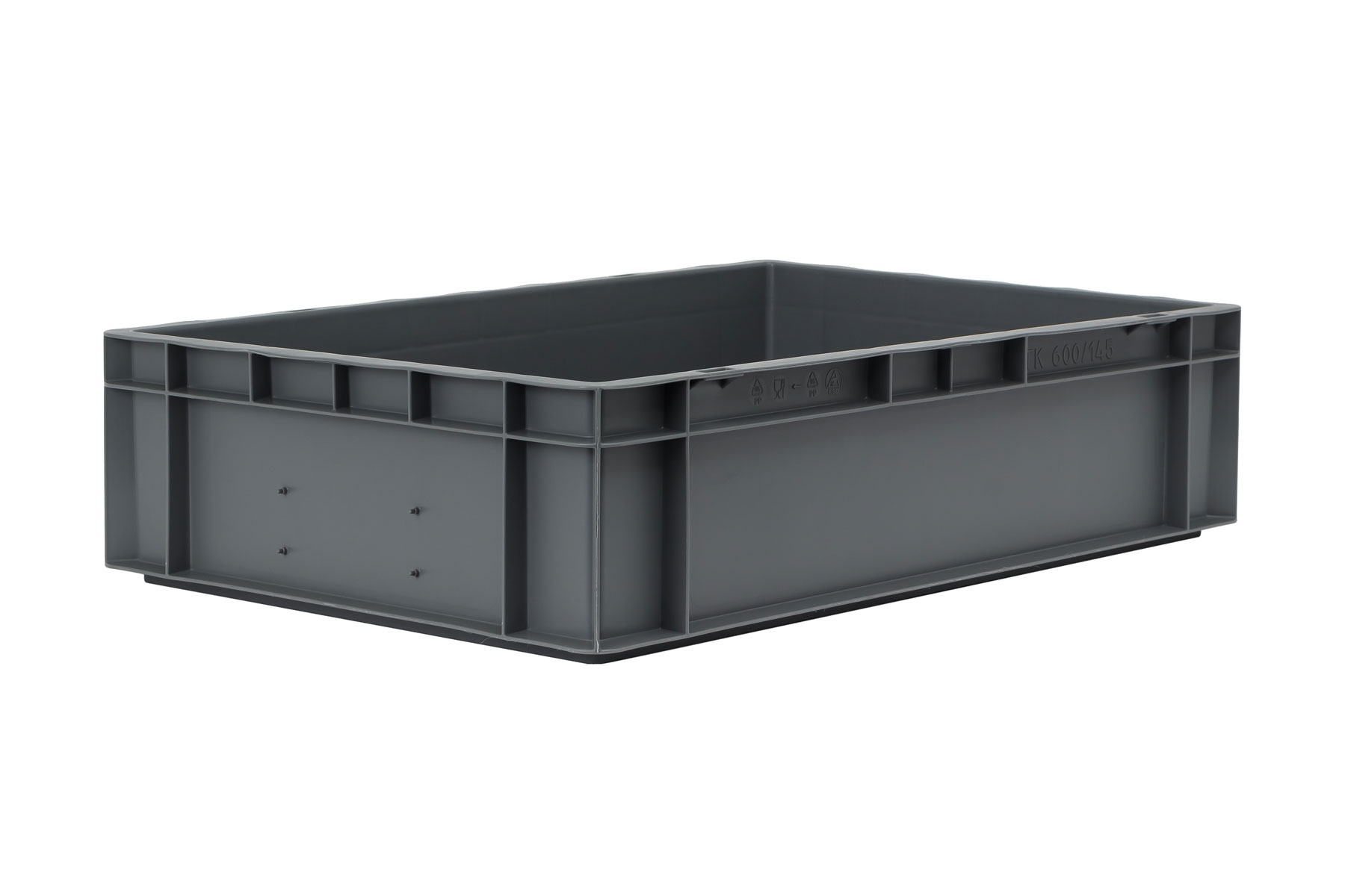 Basic information Article number: 01640145AEV Article type: Stacking Boxes Color: grey Material : PP Shipping unit : 1 piece Quantity per pallet : 52 pieces Quantity per carton : 4 pieces More product features Handles : closed hand holes Description sides : closed Base design : solid, no ribs Suitable for food-contact : suitable for food-contact Dimensions and loads External dimensions (approx.) : 600 x 400 x 145 mm Internal dimensions (approx.) : 551 x 352 x 133 mm Load capacity stat. (approx.) : 45 kg Usable volume (approx.) : 28 l -