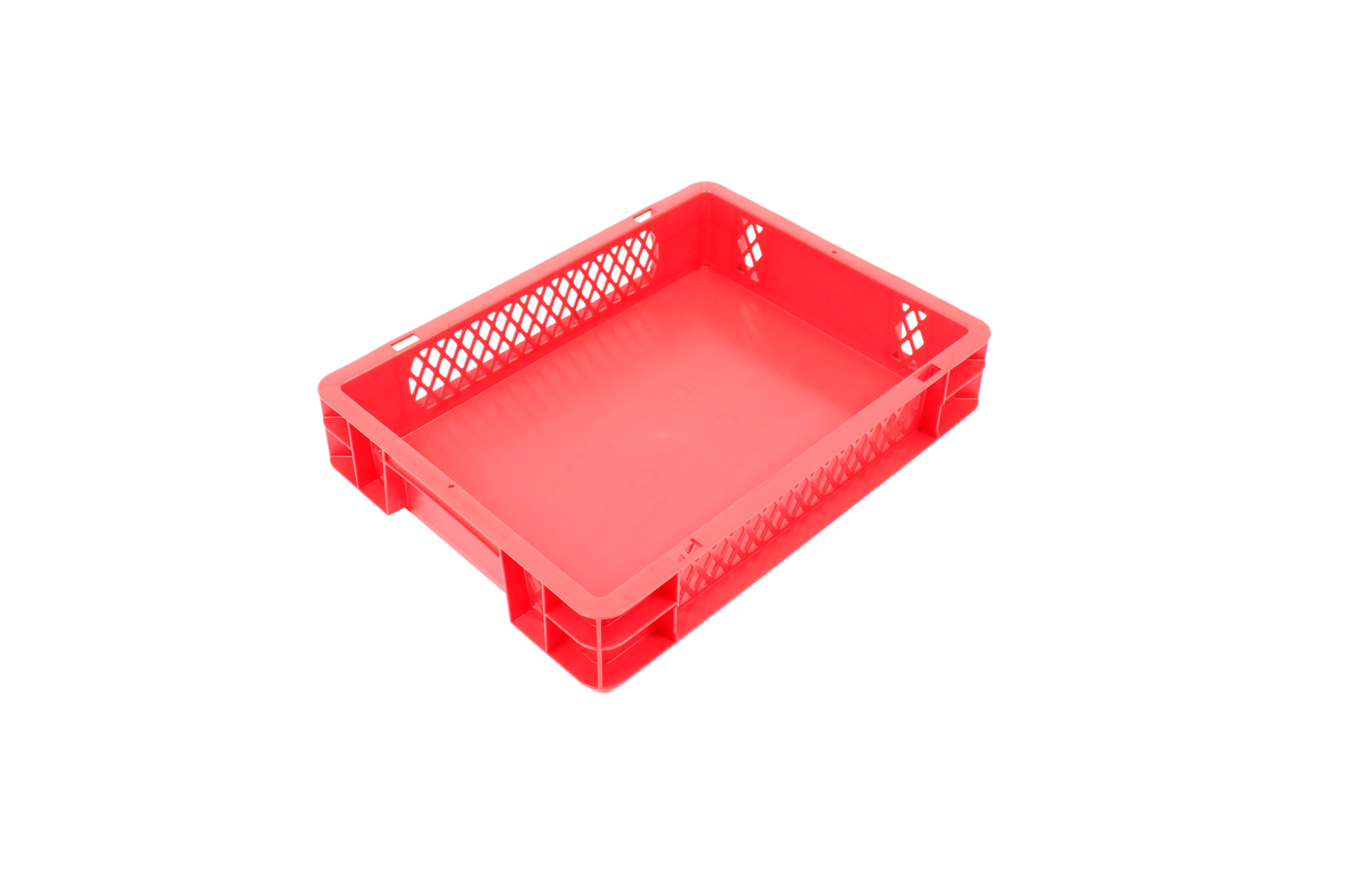 Basic information Article number: 01430075LR2 Article type: Stacking Boxes Color: red Material : PP Shipping unit : 1 piece Quantity per pallet : 160 pieces Quantity per carton : 20 pieces More product features Handles : closed hand holes Description sides : perforated Base design : solid, no ribs Suitable for food-contact : suitable for food-contact Dimensions and loads External dimensions (approx.) : 400 x 300 x 75 mm Internal dimensions (approx.) : 356 x 255 x 65 mm Load capacity stat. (approx.) : 18 kg Usable volume (approx.) : 7 l -