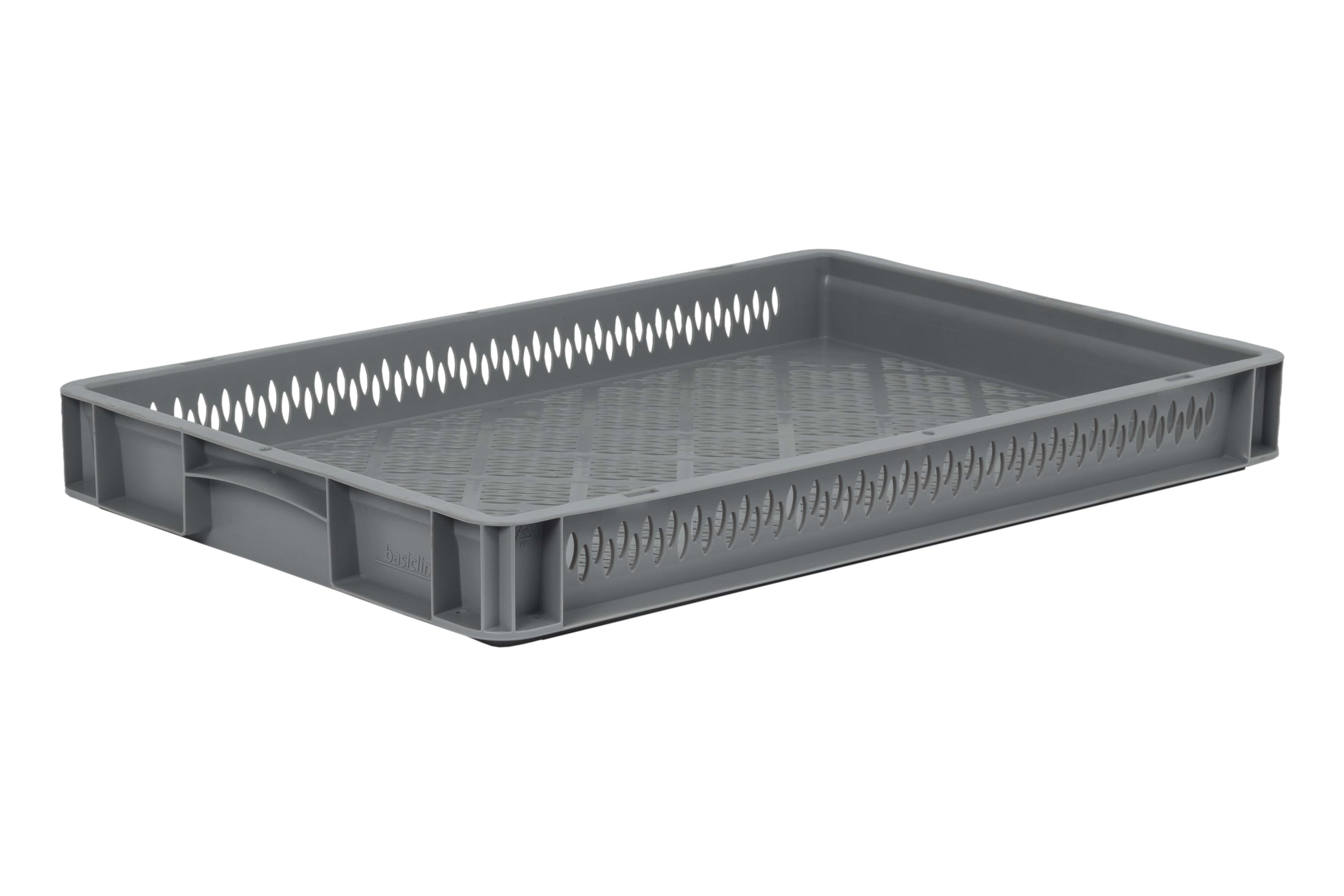 Basic information Article number: 01640072BV2 Article type: Stacking Boxes Color: grey Material : PP Shipping unit : 1 piece Quantity per pallet : 112 pieces Quantity per carton : 12 pieces More product features Handles : closed hand holes Description sides : short sides closed, long sides perforated Base design : perforated Suitable for food-contact : suitable for food-contact Dimensions and loads External dimensions (approx.) : 600 x 400 x 70 mm Internal dimensions (approx.) : 567 x 367 x 55 mm Load capacity stat. (approx.) : 30 kg Usable volume (approx.) : 11 l -