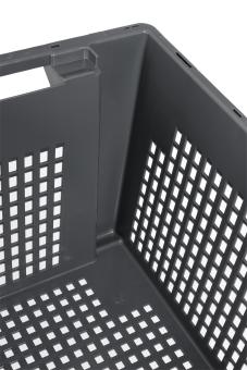 Der Drehstapelbehälter ist optimal für den Versand Ihrer Produkte geeignet, mit seinen Grundmaßen von 600 x 400 mm und einer Höhe von 350 mm. Das zähe Material Hart-Polyethylen ist besonders spannungsriss- und chemikalienbeständig. Der Drehstapelbehälter kommt mit einer durchbrochenen Bodenausführung sowie einer durchbrochenen Seitenausführung und umfasst einen Volumenbereich von 60 - 79 Litern. Zwei Eingriffe ermöglichen einen hohen Tragekomfort beim Transport des Drehstapelbehälters.
