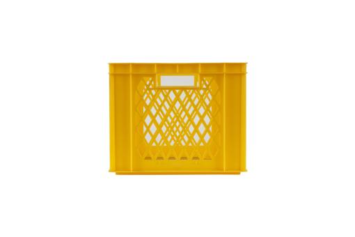 Hoge stapelkrat met geperforeerde wanden voor luchtcirculatie en goed zicht op de 59 liter inhoud. Met twee praktische grepen, in geel design.