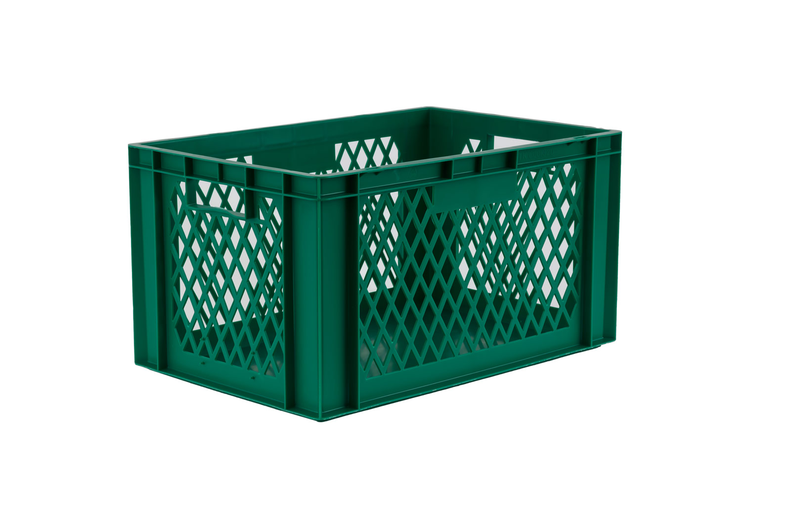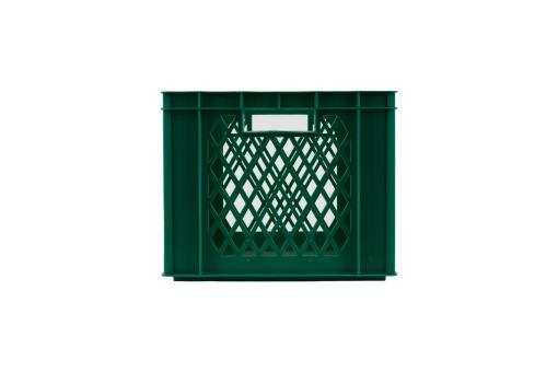 Hoge stapelkrat met geperforeerde wanden voor luchtcirculatie en goed zicht op de 59 liter inhoud. Met twee praktische grepen, in groen design.