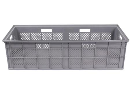 Lang model stapelkrat met 100 liter inhoud, geperforeerde wanden voor meer luchtcirculatie en goed overzicht op de goederen en zes praktische open grepen. Levering in grijs.