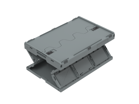 Vouwkrat met scharnierende kleppen aan de lange zijden voor optimale bescherming van de goederen, 60 liter inhoud en twee praktische open handgrepen, uitgevoerd in donkergrijs.