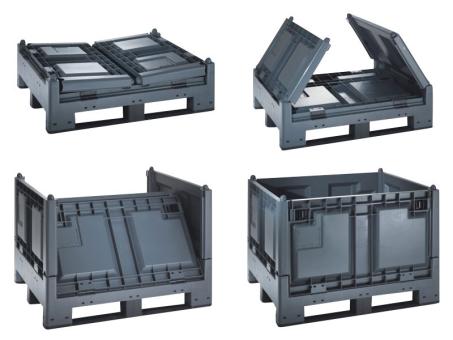 Basisgegevens Artikelnummer: 05210874EZ Artikeltype: Inklapbare grootvolume bakken Kleur: donkergrijs Materiaal : PP regeneraat Verzendeenheid : 1 stuk Pallettype : met 4 poten Verdere producteigenschappen Zijwanden : gesloten Bodem : gesloten Afmetingen en lasten Buitenafmetingen (ca.) : 1200 x 1000 x 847 mm Binnenmaten (ca.) : 1120 x 920 x 654 mm Statisch draagvermogen (ca.) : 600 kg Nuttig volume (ca.) : 650 l -