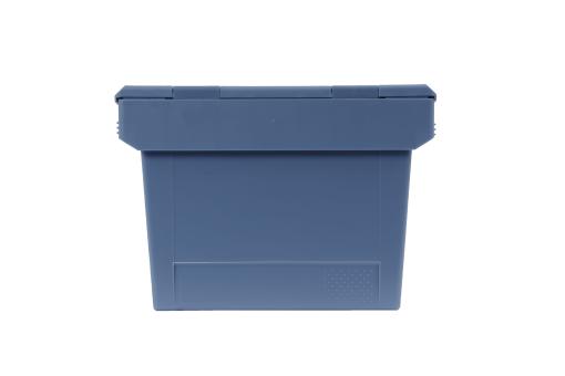 Duifblauwe, nestbare kunststof bak met praktische grepen onder de rand, 22 liter inhoud en een scharnierende klepdeksel die beschermt tegen stof en vuil.