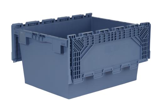 Ruimtebesparende nestbare kunststof stapelbak met praktische grepen onder de rand, die dankzij de omsnoerbare deksel voor optimale stabiliteit zorgt.