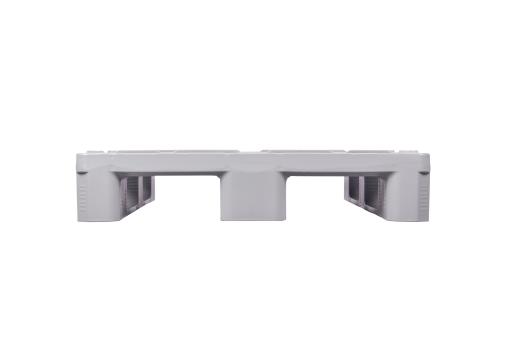 Hygiënische pallet van hoogwaardig HDPE, stabiele constructie dankzij drie sleden, met opstaande borgrand en gesloten bovendek. Heeft een draagvermogen van 4000kg bij een eigen gewicht van slechts 18kg. Model in grijs.